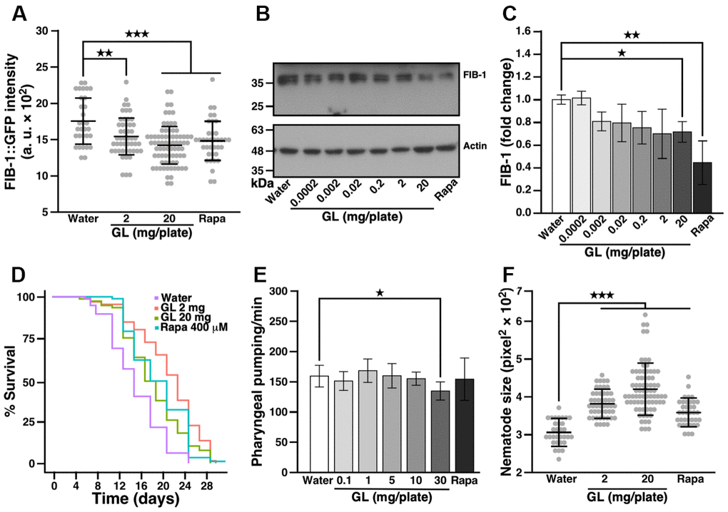 μM, Rapa). Data are expressed as arbitrary units (a. u.). (B) FIB-1 levels assessed by Western blots in wild-type N2 C. elegans treated with GL. (C) Quantification of FIB-1 protein levels shown in (B). FIB-1 expression was measured by densitometry and normalized against actin. (D) Lifespan assay of GL-treated nematodes. C. elegans
